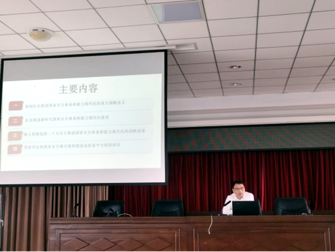 5月24日下午,校工會主席、黨委常委陶佰睿以《學思踐悟習近平總書記關于總體國家安全觀的重要論述 奮力創建平安校園》為題,從深刻認識推進國家安全體系和能力現代化的重大戰略意義、扎實推進新時代國家安全體系和能力現代化建設、深入貫徹黨的二十大關于推進國家安全體系和能力現代化的戰略部署、堅持用總體國家安全觀引領和推進高質量平安校園建設四個方面進行詳細闡述。強調全校師生要進一步要提高政治站位,深刻領會總體國家安全觀的豐富內涵和實踐要求,堅決貫徹落實黨中央和省委關于安全工作的決策部署,把維護校園安全貫穿辦學治校各方面全過程,確保師生生命財產安全,為建設有特色高水平應用型綜合大學提供安全穩定環境。