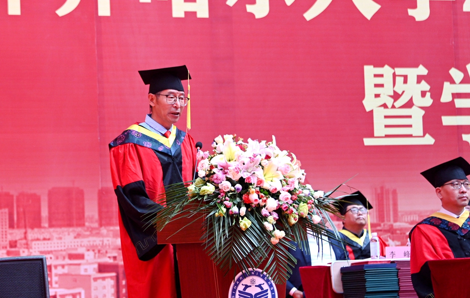 他說,“畢業”既標志著一段學習經歷的完結,也標志著人生新的征程的開啟。回首往昔,你們在齊大度過了一段極不平凡的青春歲月,在美麗的環湖大學,度過了最美的青春時光。特別是你們在學校,學習生活期間,克服了疫情影響,圓滿完成了學業,以各方面的優異表現,交上了一份完美的畢業答卷。你們彰顯著齊大學子的家國情懷和赤子之心,傳遞了齊大正能量和好聲音。母校為你們點贊,向你們致敬!作為校長,我為大家圓滿完成學業感到由衷地高興,更對同學們的美好未來充滿著期待!臨別之際,我對同學們提出四點希望和囑托:一是希望你們樹立遠大理想,堅定信仰信念;二是希望你們心懷“國之大者”,擔當時代責任;三是希望你們堅持吃苦耐勞,始終砥身礪行;四是希望你們保持永久奮斗,投身強國偉業。