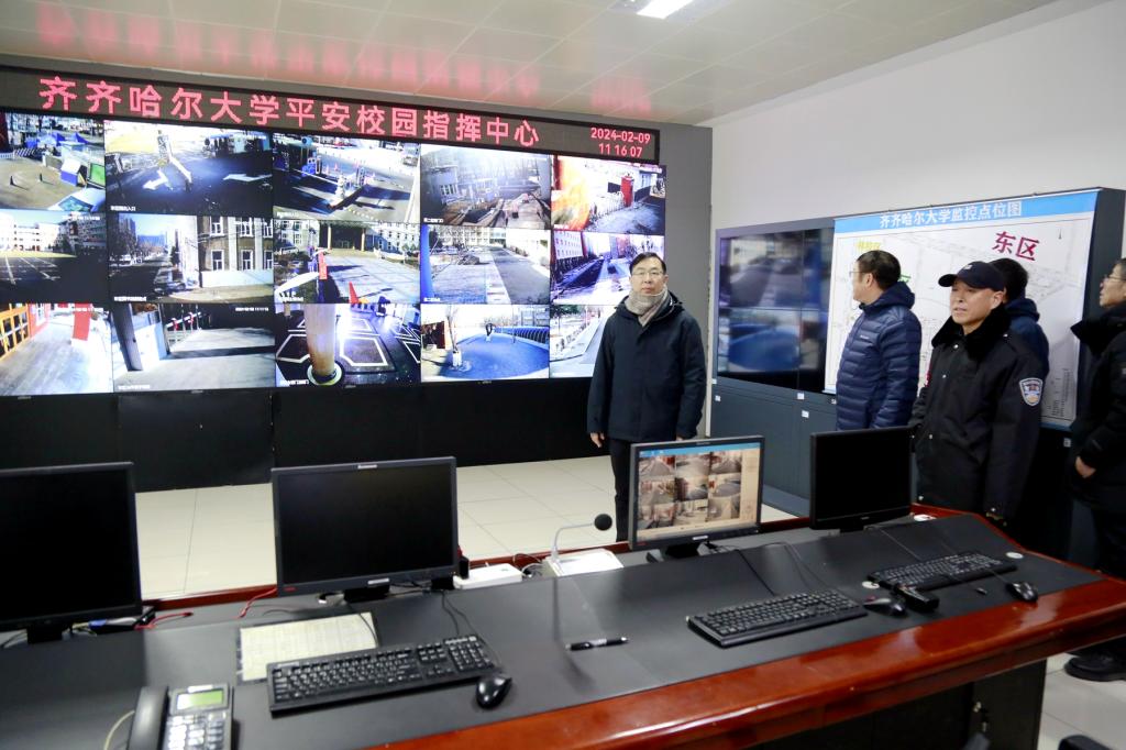 在校110指揮中心,郝文斌一行通過大屏幕實時查看了學(xué)校的安全保障工作情況。在詳細了解值班值守和設(shè)備運行保障情況后,郝文斌代表學(xué)校向一線值守職工“舍小家、為大家”的精神表示敬意,感謝他們履職盡責(zé)、無私奉獻,同時叮囑大家要按照安全生產(chǎn)操作規(guī)程做好自身防護和設(shè)備隱患排查,以扎扎實實、踏踏實實、求真務(wù)實的作風(fēng)做好本職工作,守好校園安全穩(wěn)定底線。