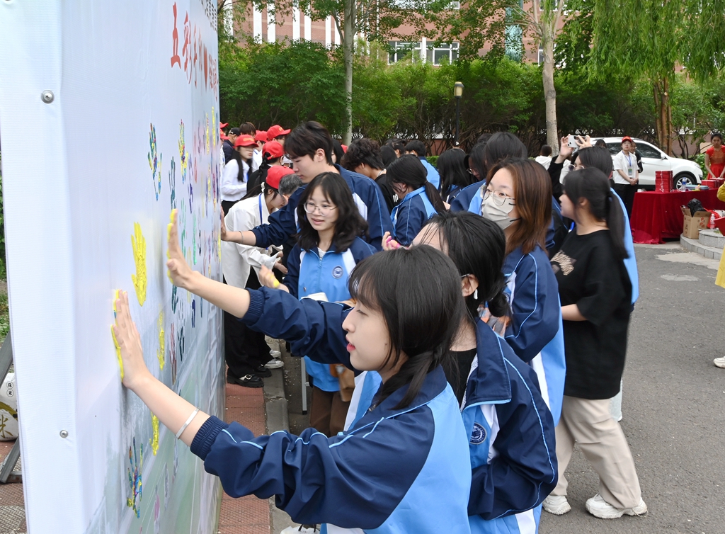 活動(dòng)開始前,現(xiàn)場(chǎng)的領(lǐng)導(dǎo)、老師和同學(xué)們?cè)凇拔宀适钟。邤糖啻骸敝黝}展板上留下心靈印記,描繪青春夢(mèng)想和希望,簽名記錄美好時(shí)光。