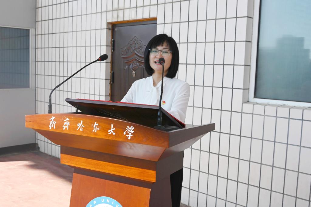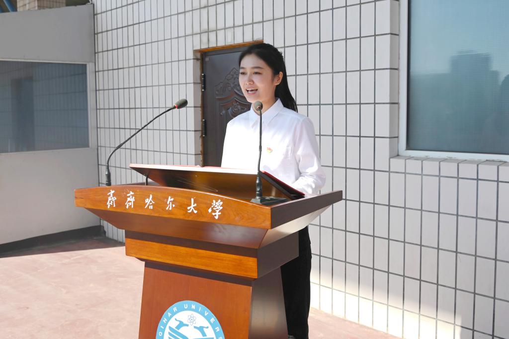 教師代表、黑龍江省青年教學名師、齊齊哈爾市第十屆青年五四獎章獲得者、生命科學與農林學院副院長、李珊珊教授發言。她代表全體教師歡迎新生加入齊大大家庭,她表示,同學們對美好大學生活的向往,就是老師們的期望,全體教師將傾聽同學們的聲音,用心用情陪伴同學們成長。她希望大家堅定奮斗目標、刻苦學習鉆研、矢志科技報國,努力成為齊大精神的傳承者,為推進學校有特色高水平應用型綜合性大學建設,添磚加瓦、增光添彩。