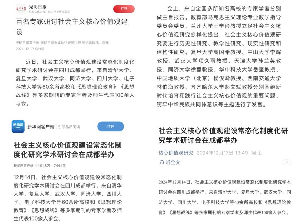 12月14日,社會主義核心價值觀建設(shè)常態(tài)化制度化研究學(xué)術(shù)研討會在四川成都舉行。本次會議由社會主義核心價值觀協(xié)同創(chuàng)新中心、教育部人文社會科學(xué)重點(diǎn)研究基地清華大學(xué)高校德育研究中心和電子科技大學(xué)聯(lián)合主辦。來自清華大學(xué)、復(fù)旦大學(xué)、武漢大學(xué)、中山大學(xué)、同濟(jì)大學(xué)、四川大學(xué)、電子科技大學(xué)、齊齊哈爾大學(xué)等60余所高校和《思想理論教育》《思想戰(zhàn)線》等多家期刊的專家學(xué)者及師生代表等100余人參會。光明日報、新華網(wǎng)客戶端等權(quán)威媒體對會議作了專題報道。
