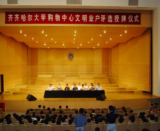 創建文明服務窗口是創建文明校園的有機組成部分。按照《齊齊哈爾大學創建文明單位活動實施意見》和校產總公司創建文明單位活動規劃,6月25日上午,我校在音樂廳召開購物中心文明業戶評選授牌大會,副校長張忠恒出席,校黨委宣傳部、校團委、校保衛處、校產總公司等單位有關負責人、購物中心全體業戶代表、各學院學生代表500余人參加了大會。