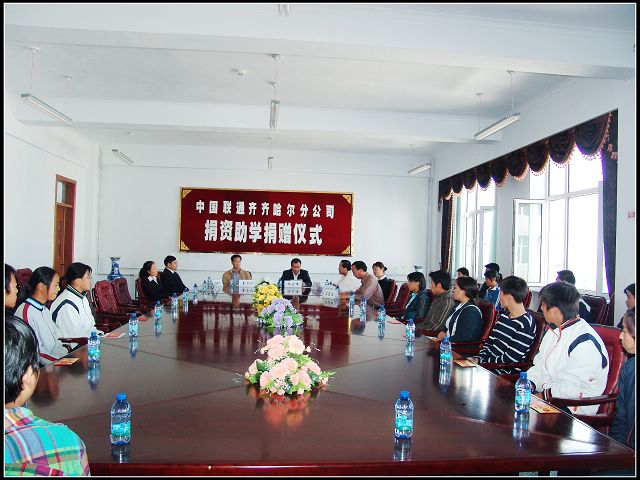 9月27日中午,中國聯通齊齊哈爾分公司在我校西區教學主樓606室舉行了捐贈儀式。副校長姜守訓出席儀式并講話,校學生處、中國聯通齊齊哈爾分公司有關人員及全體受資助學生參加了儀式,學生處副處長吳寶柱主持了捐贈儀式。