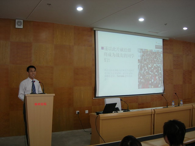 發布日期:2006-05-30 點擊量:畢業生如何選擇外資企業、合資企業就業,如何設計個人的職業生涯規劃,這是許多在校學生希望了解的,5月24日,瑞士科萊恩公司中國有限公司北方區市場部經理馬軍龍先生應邀來到學校,就這方面的問題為輕紡學院及其他學院部分學生做了一場精彩的講座。 馬軍龍先生此次講座的題目是“畢業生職業生涯規劃”。如何規劃你的職業發展?畢業學生所從事的職業特點及其要求?外資企業對不同人才的要求;常見的面試問題及其背后的含義,如何準備面試?如何進行英文的自我陳述?馬軍龍先生就外國企業、合資企業對員工的要求,并結合中國大學生在外企、合企的工作情況,以及自己多年在外企中工作的經歷和體會,從五個方面做了講解和說明。同學們感到這是一次非常有意義的講座,收獲很大。