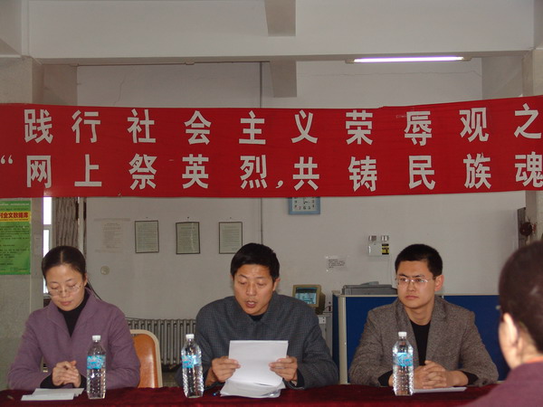 為貫徹胡錦濤總書記關(guān)于樹立社會主義榮辱觀的重要講話精神, 4月5日下午,我校團(tuán)委在學(xué)校西區(qū)圖書館三樓電子閱覽室集中組織了踐行社會主義榮辱觀之“網(wǎng)上祭英烈,共鑄民族魂”網(wǎng)上公祭活動。公祭活動儀式由校團(tuán)委副書記李秀梅主持,校團(tuán)委書記黃偉中講話。校團(tuán)委工作人員、各學(xué)院團(tuán)委書記、各校級學(xué)生組織代表、各學(xué)院學(xué)生代表共100余人參加了這次主題教育活動。