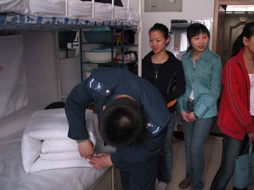 4月26日下午,93251部隊的官兵應藝術學院音樂系學生會的邀請來到寢室,參觀并細心指導同學們整理內務,由此拉開了藝術學院寢室文化建設的序幕。同學們紛紛表示要以官兵們為榜樣,嚴格要求自己,牢記 “八榮八恥”,明榮辱,辯是非,扎實學習、努力工作,作合格大學生。