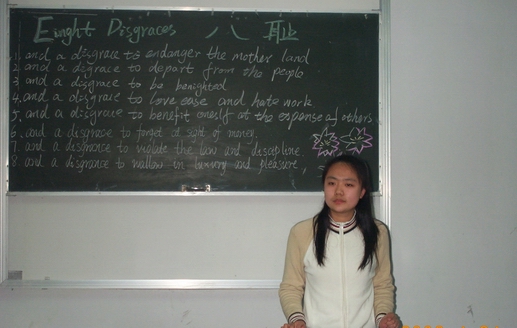 5月9日晚,應用技術學院英語口語協會結合英語學習,進行了一次暢談“八榮八恥”學習心得活動。他們將“八榮八恥”逐條翻譯成了英文,大家既學習了英文知識,又加深了對“八榮八恥”的理解和記憶。同時學生會還舉辦了“八榮八恥”了大型征文展,在全院共征集征文504篇,同學們通過文章表達了自己學習和踐行社會主義榮辱觀的心得和收獲。