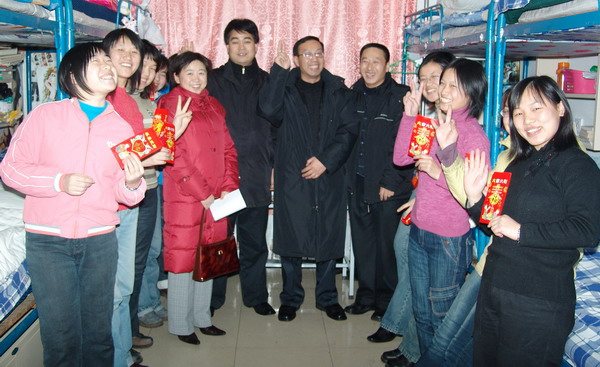 2006年1月26日晚,校學生處副處長吳寶柱與學生資助科科長張培華、舍務科科長王國義、學生資助科李靜老師等帶著學校領導的親切囑托來到4#、14#、15#學生公寓,看望并慰問在春節期間留校度寒假的大學生。 學生處有關人員一行向在春節期間留校度寒假的大學生轉達了學校領導的關懷與慰問之情,向他們致以節日的祝福。