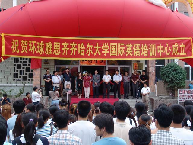 6月15日下午,環(huán)球雅思國際英語培訓(xùn)中心在我校外語學(xué)院舉行揭牌儀式。我校校長唱江華、副校長鄭喜群和副市長馬立群、齊市高專黨委書記楊民及環(huán)球雅思北京總部張永琪校長等出席成立大會暨揭牌儀式。副校長鄭喜群主持成立大會暨揭牌儀式。