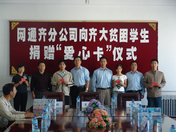 9月14日下午1時(shí),中國(guó)網(wǎng)通齊齊哈爾分公司向貧困學(xué)生捐贈(zèng)"愛(ài)心卡"的儀式在我校西區(qū)主樓606會(huì)議室舉行。齊齊哈爾通信分公司副總經(jīng)理李巖、齊齊哈爾通信分公司瀏園分局局長(zhǎng)劉松濤、副局長(zhǎng)高宏偉、閆偉,我校學(xué)生處處長(zhǎng)王剛、副處長(zhǎng)吳寶柱及相關(guān)工作人員與來(lái)自各學(xué)院的30名貧困生代表參加了儀式。