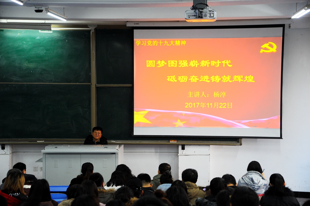 在中區11教階梯202教室,校黨的十九大精神宣講團成員、食品與生物工程學院黨委書記楊淳副教授以《圓夢圖強嶄新時代 砥礪奮進鑄就輝煌》為題,詳細介紹了黨的十八大以來我國經濟、政治、文化、社會、生態文明建設等方面取得的巨大成就,突出強調了反腐、精準扶貧、國防和軍隊改革是人民群眾最關注、最吸引眼球的三大亮點。他指出,黨的十八大以來的五年,以習近平同志為核心的黨中央高舉中國特色社會主義偉大旗幟,準確把握中國經濟發展所處歷史新方位,團結和帶領全國人民為實現中華民族偉大復興中國夢而努力奮斗、砥礪奮進,取得了舉世矚目的偉大成就。解決了許多長期想解決而沒有解決的難題,辦成了許多過去想辦而沒有辦成的大事。輕工與紡織學院全體教職工、學生黨員及入黨積極分子參加了宣講活動。