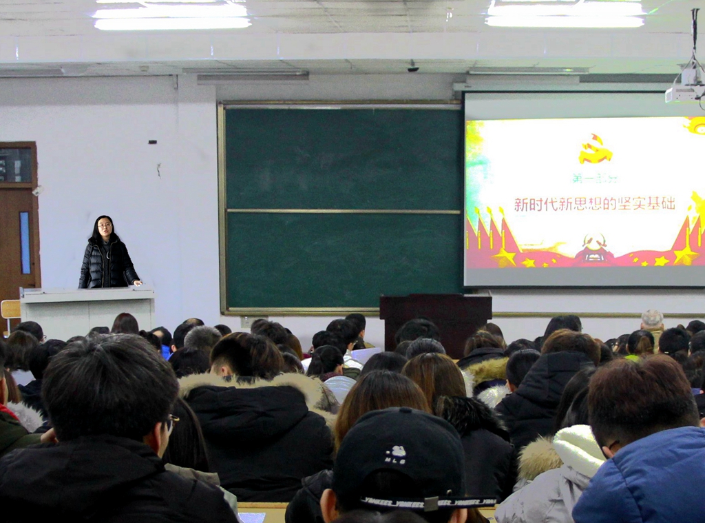 在西區1教階梯203教室,校黨的十九大精神宣講團成員、馬克思主義學院中國近現代史綱要教研部主任、碩士生導師張春波副教授以《新思想引領新時代 新使命開啟新征程》為題,從新時代、新矛盾——進行偉大斗爭,新理論、新思想——建設偉大工程,新任務、新舉措——推進偉大事業,新使命、新征程——實現偉大夢想等四個方面闡釋了黨的十九大的“新”。他指出,只有進行新的偉大斗爭才能開創新時代,解決新矛盾。只有以馬克思主義中國化最新成果——習近平新時代中國特色社會主義思想為行動指南,才能建設新的偉大工程。他分析了推進中國特色社會主義偉大事業的新任務和新舉措,提出在實現中華民族偉大復興中國夢的新征程中廣大師生的使命擔當。理學院、應用技術學院全體教職工、學生黨員及入黨積極分子參加了宣講活動。
