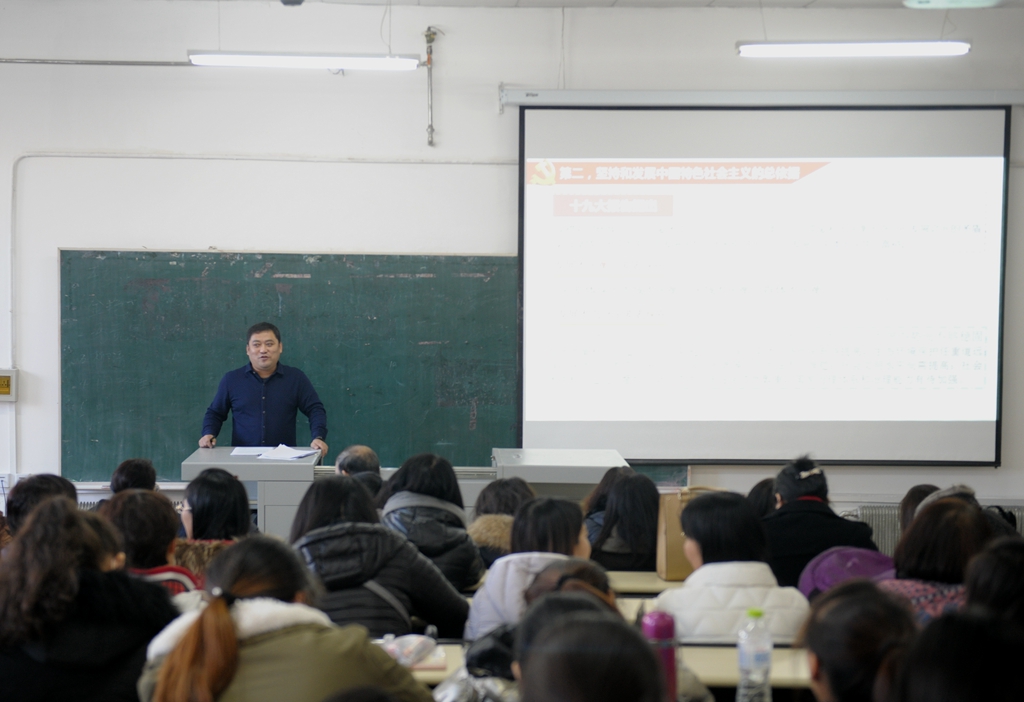在東區26教第二階梯教室和25教階梯301教室,校黨的十九大精神宣講團成員、哲學與法學學院政治學與行政學專業徐鳳江副教授以《深入推進新時代黨的建設的偉大工程》為題,在講述了新時代全面加強黨的建設的必要性、黨的十八大以來黨的建設的重要手段、措施及成就后,著重解讀了新時代黨的建設的總要求、新時代黨的建設的八項重點任務。他指出,學習領會黨的十九大精神,要緊緊圍繞習近平新時代中國特色社會主義思想這個主線,堅持讀原著、學原文、悟原理,做到學深悟透。通過學習引導全黨自覺維護習近平總書記作為黨中央的核心、全黨的核心地位,維護黨中央權威和集中統一領導。把師生的思想和行動統一到黨的十九大精神上來,把力量凝聚到黨的十九大確定的各項任務上來。外國語學院、音樂與舞蹈學院全體教職工、學生黨員及入黨積極分子參加了宣講活動。