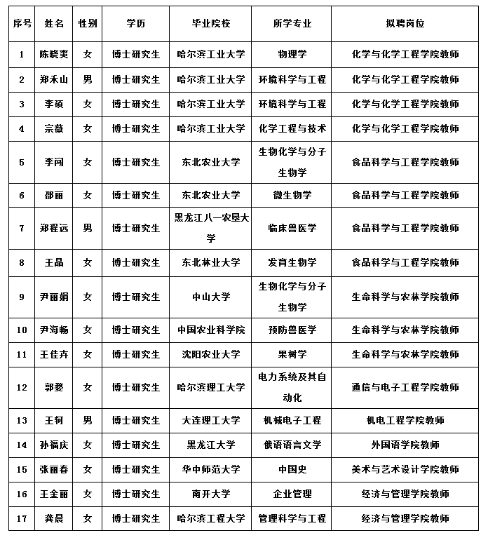 按照《黑龍江省事業單位公開招聘工作人員實施細則》的規定,根據《齊齊哈爾大學2018年上半年公開招聘人員公告》明確的原則、程序和方法,現將擬聘用人員予以公示。如對公示人員有異議,可在公示期內反映,反映情況和問題必須實事求是,應簽署或告知真實姓名、工作單位和聯系方式;對線索不清的匿名信和匿名電話,公示期間不予受理。