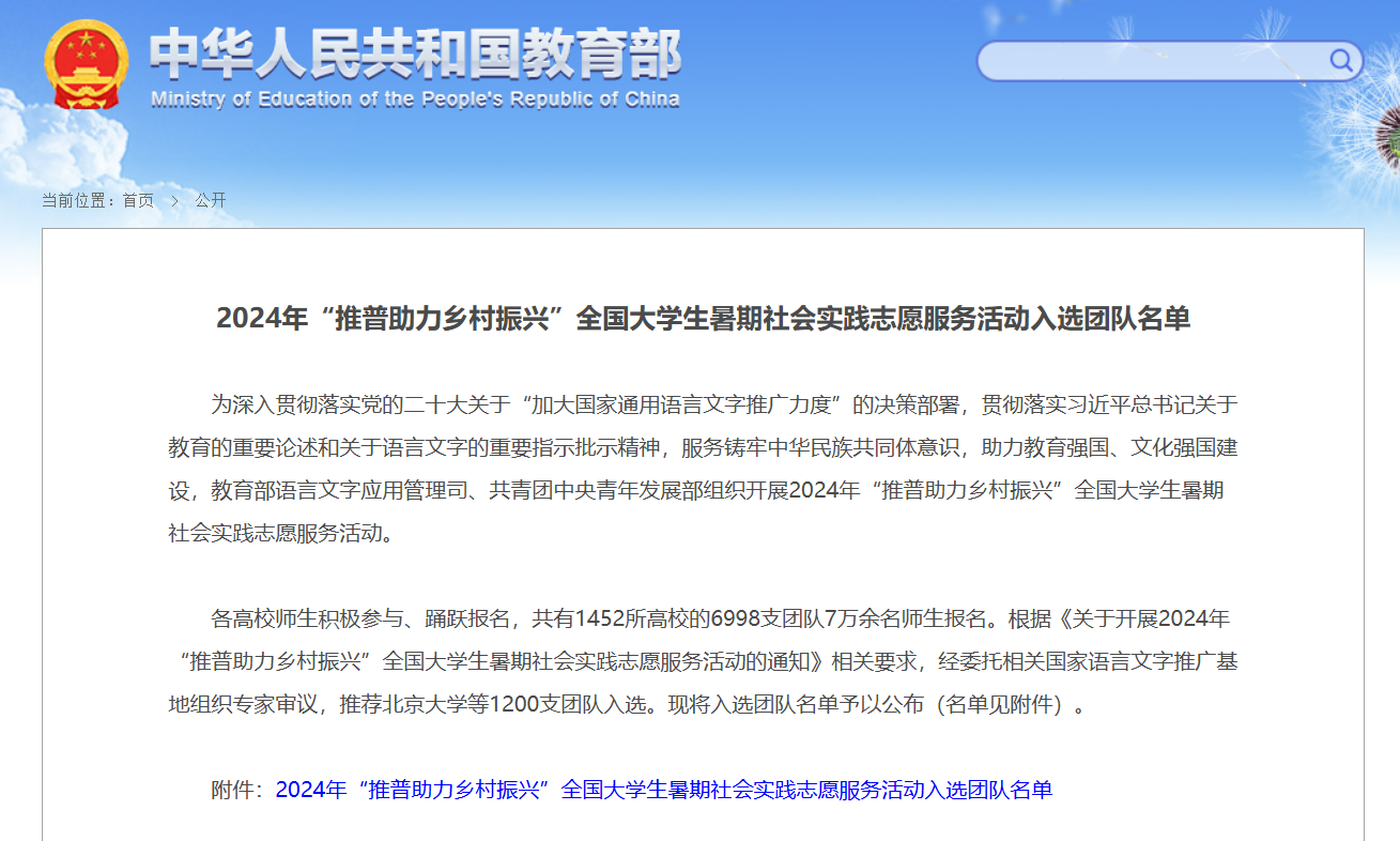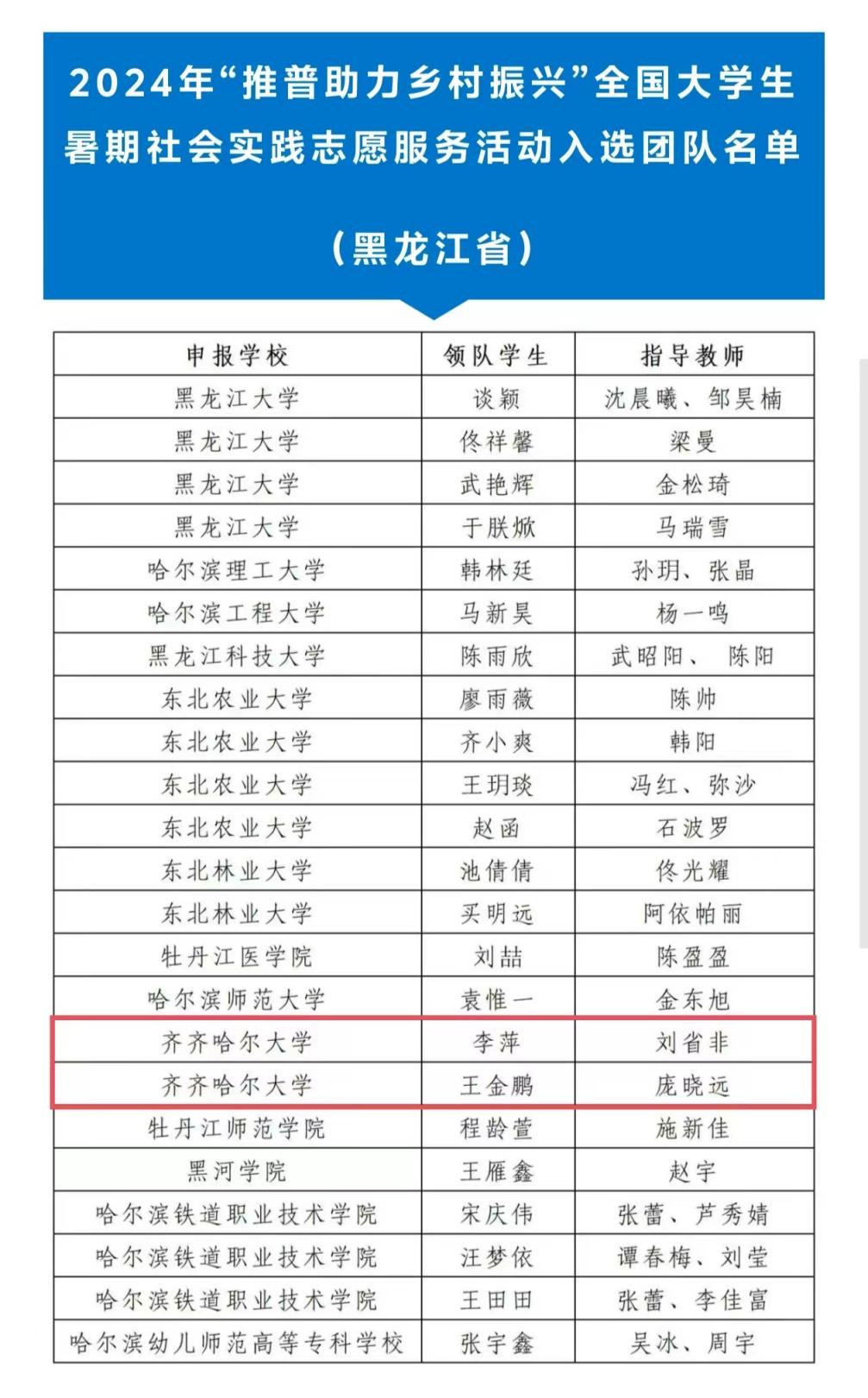 近日,教育部網站公布2024年“推普助力鄉村振興”全國大學生暑期社會實踐志愿服務活動入選團隊名單。經委托相關國家語言文字推廣基地組織專家審議,推薦1200支團隊入選,黑龍江23支團隊上榜,其中我校出彩龍江志愿服務隊、研究生志愿服務隊兩支團隊從全國1452所高校的6998支團隊中脫穎而出,成功入選,評選結果被學習強國等平臺轉載。