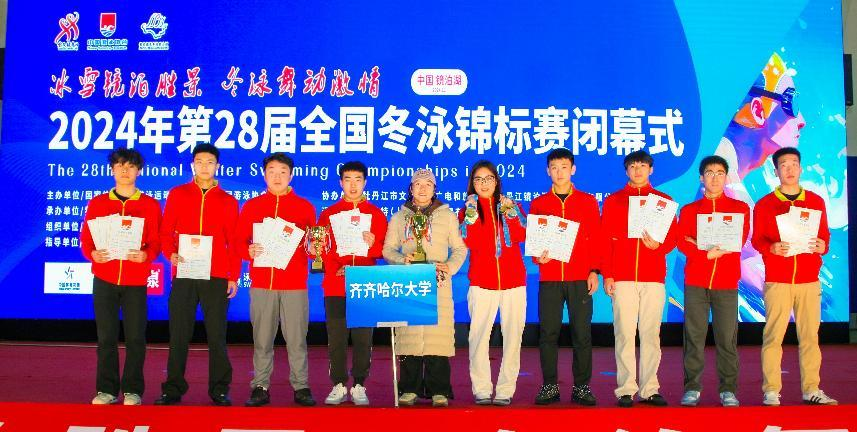 11月9至10日,由國家體育總局游泳運動管理中心、中國游泳協(xié)會主辦,牡丹江市人民政府承辦的第28屆全國冬泳錦標(biāo)賽在牡丹江市鏡泊湖吊水樓瀑布景區(qū)的黑龍?zhí)杜e行,本次比賽吸引了來自全國18個省市的31支代表隊近700名運動員參賽。我校游泳隊在本次全國級別的賽事中取得歷史性突破,共獲得單項6個第一名、2個第二名、1個第三名,以及青年組團體總分第一名的優(yōu)異成績。