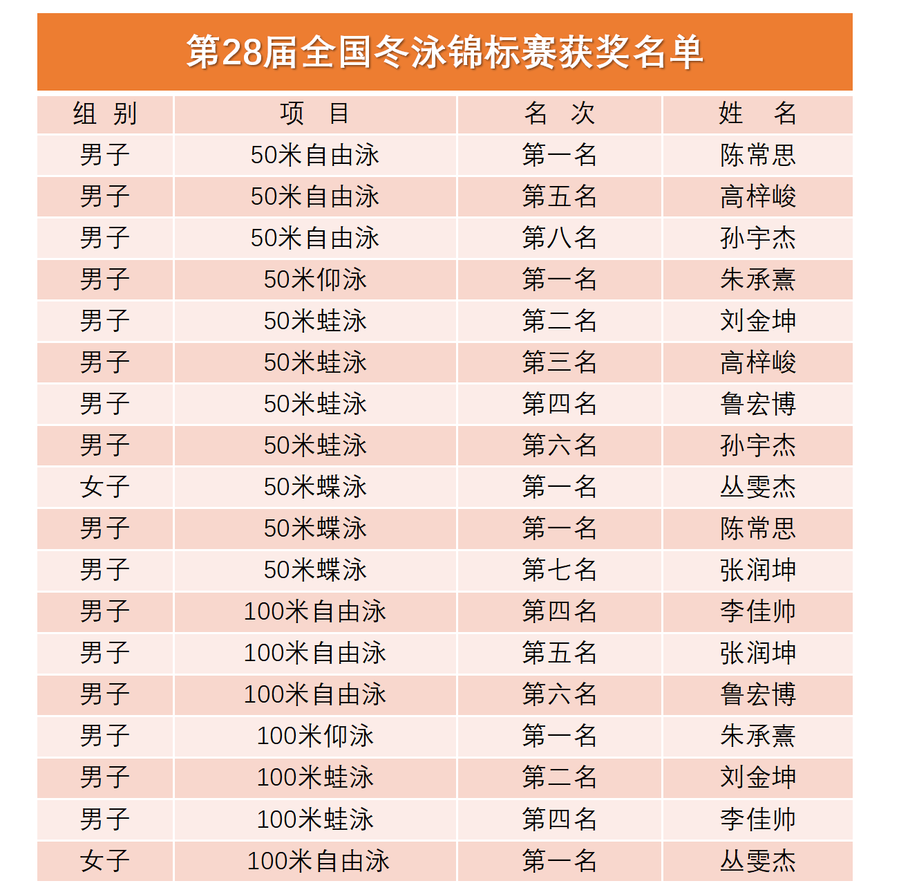 我校共選派10名運動員組成參賽隊伍,所有隊員參加青年18-29歲組比賽,體育學(xué)院王妍妮老師擔(dān)任教練。比賽過程中,我校游泳隊不斷拼搏,克服溫度低等重重困難,充分發(fā)揮出自身較高的訓(xùn)練水平,力克強勁對手,出色的完成了比賽任務(wù)。