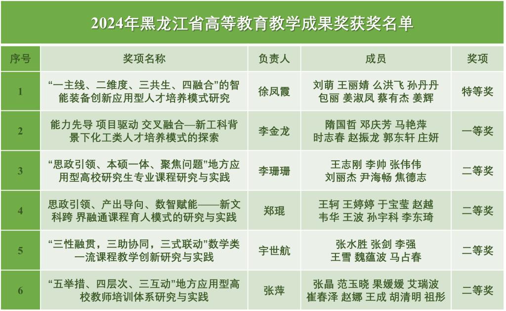 近日,黑龍江省教育廳發布了《關于公布2024年黑龍江省高等教育(本科、研究生)和職業教育教學成果獎獲獎名單的通知》(黑教發〔2025〕5 號),我校共獲獎6項,其中特等獎1項、一等獎1項、二等獎4項,實現了省高等教育教學成果獎特等獎零突破!