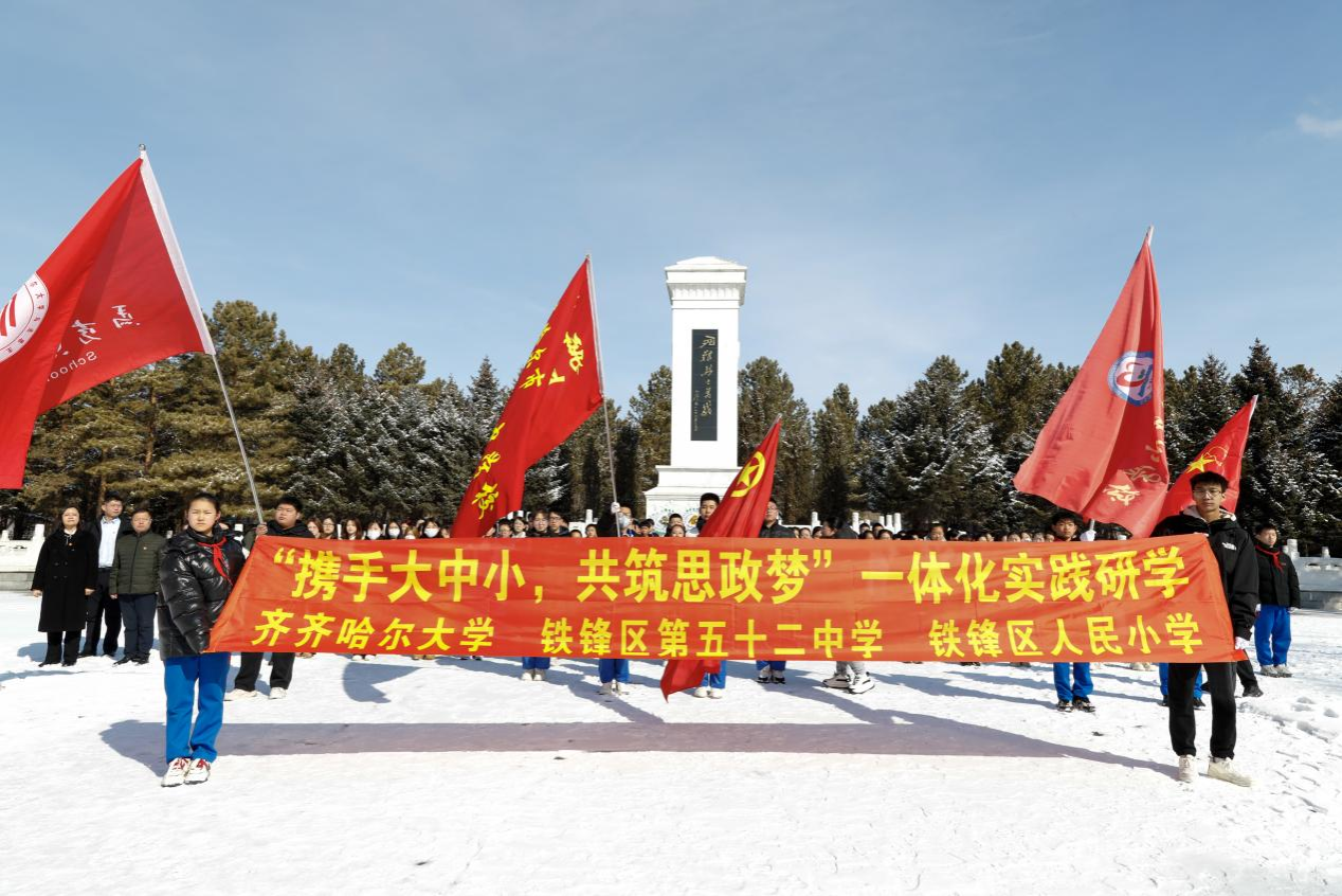 為深化大中小學(xué)思想政治理論課一體化建設(shè),3月27日,學(xué)校《毛澤東思想和中國(guó)特色社會(huì)主義理論體系概論》課程開(kāi)展社會(huì)實(shí)踐活動(dòng),聯(lián)合齊齊哈爾市人民小學(xué)、第五十二中學(xué)師生代表,共同赴西滿烈士陵園開(kāi)展了“攜手大中小,共筑思政夢(mèng)”一體化實(shí)踐研學(xué)系列活動(dòng),此次活動(dòng)以“賡續(xù)紅色血脈 凝聚奮進(jìn)力量”為主題,通過(guò)沉浸式實(shí)踐教學(xué),推動(dòng)不同學(xué)段學(xué)生在紅色教育中實(shí)現(xiàn)思想共鳴與精神共育。