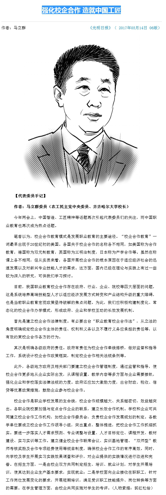 編者按:3月14日出版的《光明日報》在第6版“兩會特刊”專欄中刊發了我校校長馬立群的“代表委員手記”,隨后光明網、人民網、人民政協網、中國社會科學網、中國青年網、中青在線、東北新聞網、東方網、南海網、中國網東海資訊等網絡媒體進行了轉載。