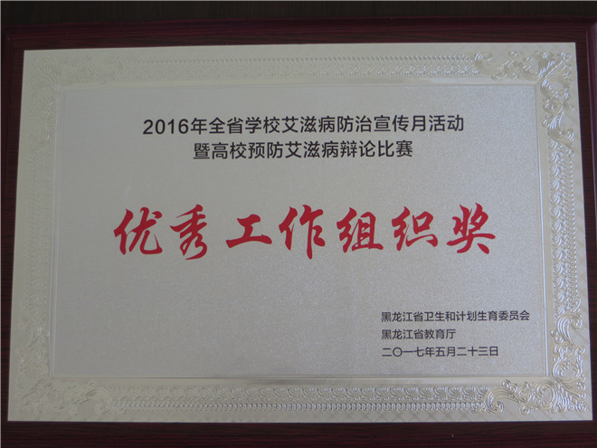 2017年5月23日,在黑龍江省衛生和計劃生育委員會與省教育廳聯合舉辦的2016年高校預防艾滋病辯論賽總結和表彰會上,我校榮獲2016年全省學校艾滋病防治宣傳月活動暨高校預防艾滋病辯論比賽優秀工作組織獎。