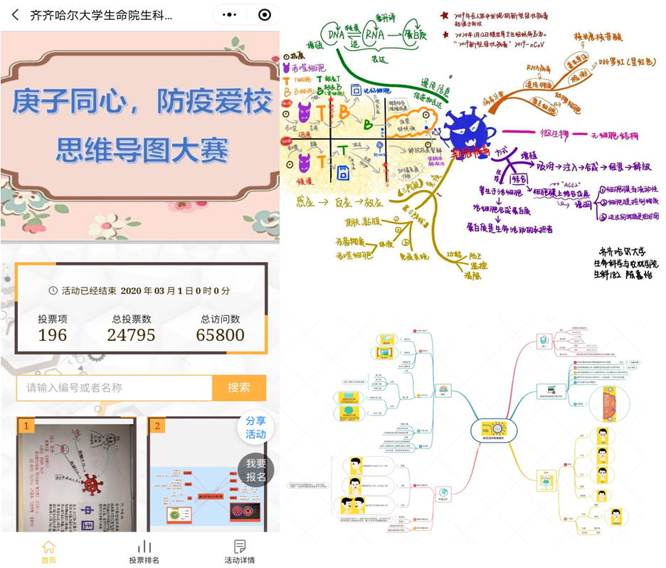 為幫助同學(xué)們了解新型冠狀病毒的危害和疫情的嚴(yán)峻形勢,提高同學(xué)們的預(yù)防意識,結(jié)合生物科學(xué)學(xué)科特點(diǎn),通過網(wǎng)絡(luò)投票的形式舉辦了“庚子同心,防疫愛校”思維導(dǎo)圖和書法作品大賽,其中思維導(dǎo)圖比賽針對2017和2018級生物科學(xué)專業(yè)學(xué)生展開,活動(dòng)期間(2020年2月26日-3月1日)共有196名同學(xué)報(bào)名參加,總投票數(shù)為24795票,總訪問量達(dá)65798次。全體2019級生物科學(xué)專業(yè)學(xué)生參加了書法作品比賽,從2020年2月18日上傳作品,至3月1日活動(dòng)結(jié)束,總投票人數(shù)為3343人,總票數(shù)達(dá)26071票。同學(xué)們參與活動(dòng)熱情高漲,作品內(nèi)容緊緊圍繞防范疫情,愛國愛校,通過活動(dòng)激發(fā)了同學(xué)們學(xué)習(xí)的熱情,緩解了緊張的情緒。全院教師也對積極參與此系列活動(dòng)的評選,并對活動(dòng)目的和作品內(nèi)容大加贊賞。